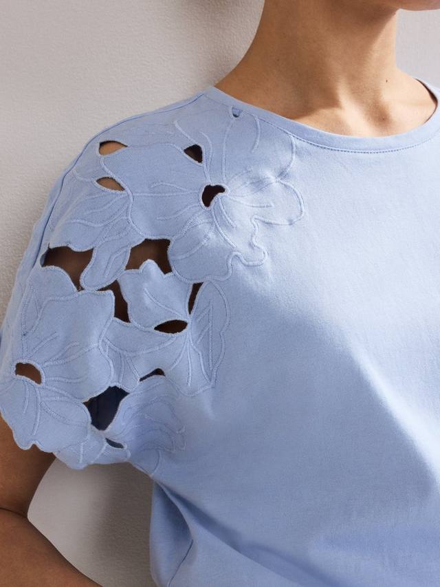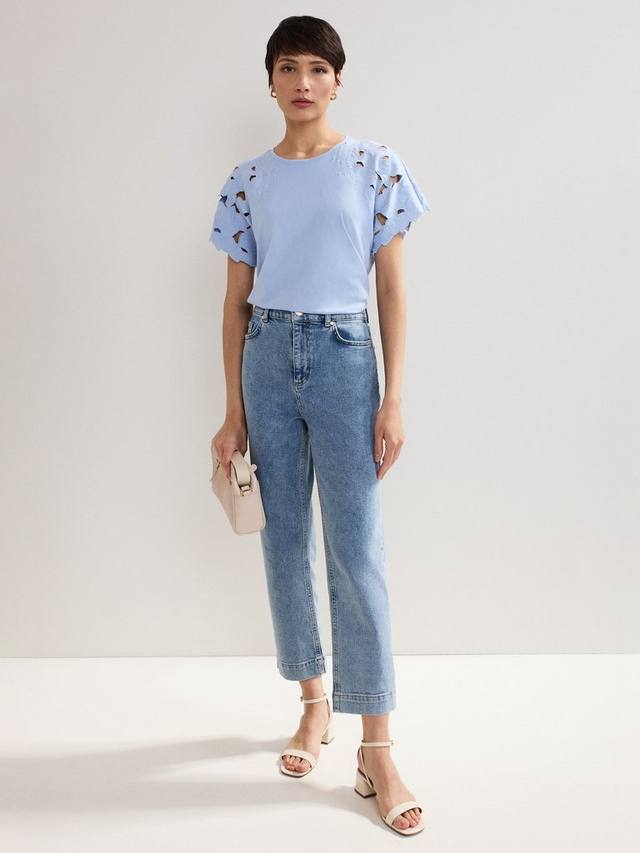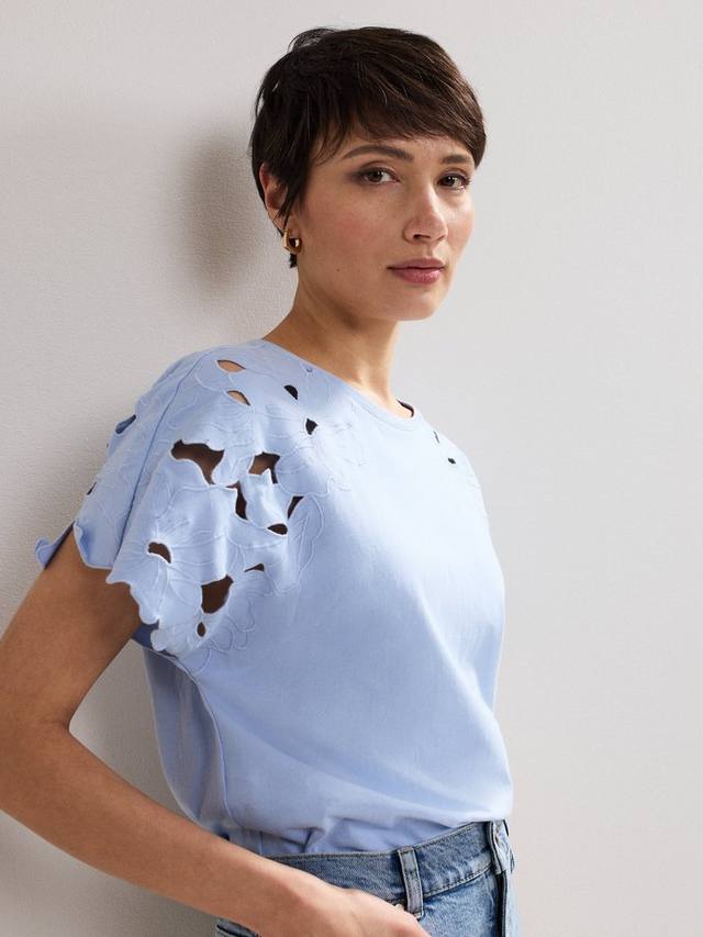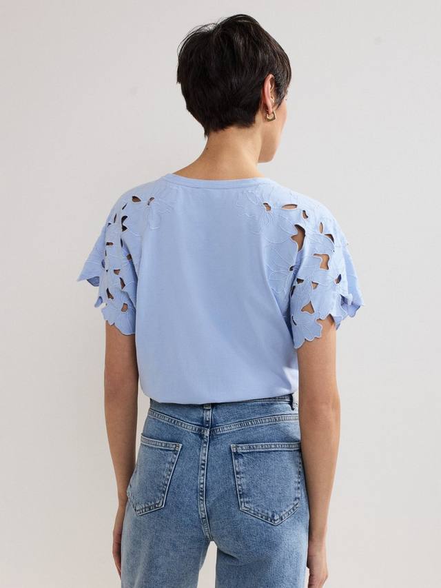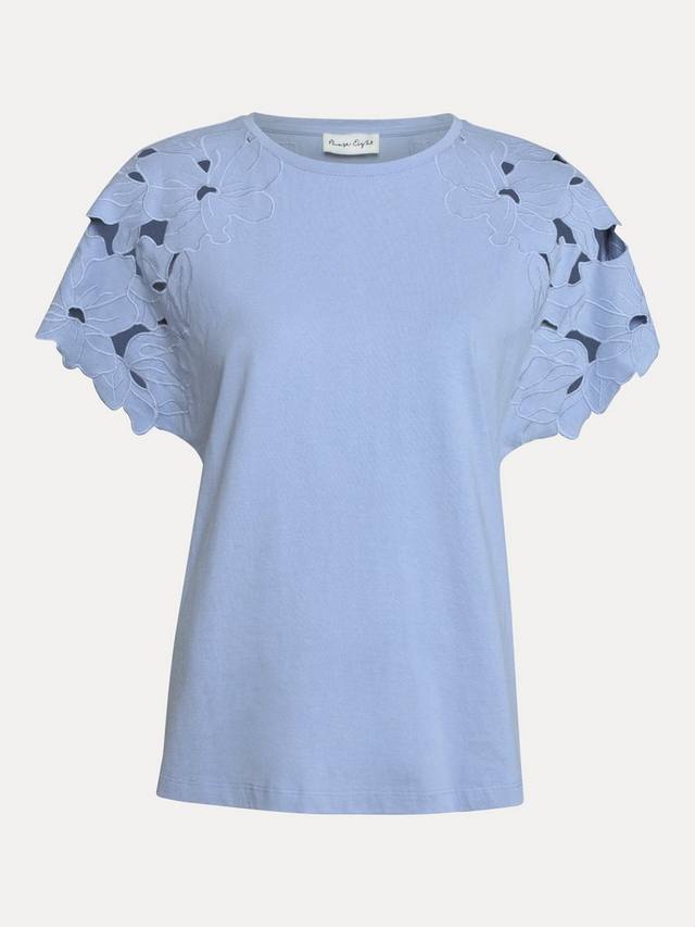 Добавьте этот весенний топ в свой базовый гардероб. Ажурная отделка на рукавах придаёт этой классической футболке современный вид. Она идеально сочетается с вашими любимыми брюками и сандалиями для создания повседневного образа.