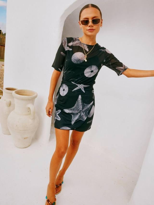Из фирменной сетчатой ткани он идеально подходит для прохлады под солнечным отпуском. Великолепный принт с ракушками, вдохновлённый приключениями NFD на Балеарских островах, по-настоящему отражает сочетание эклектичного стиля Каэтаны и наших принтов, создающих ощущение комфорта.