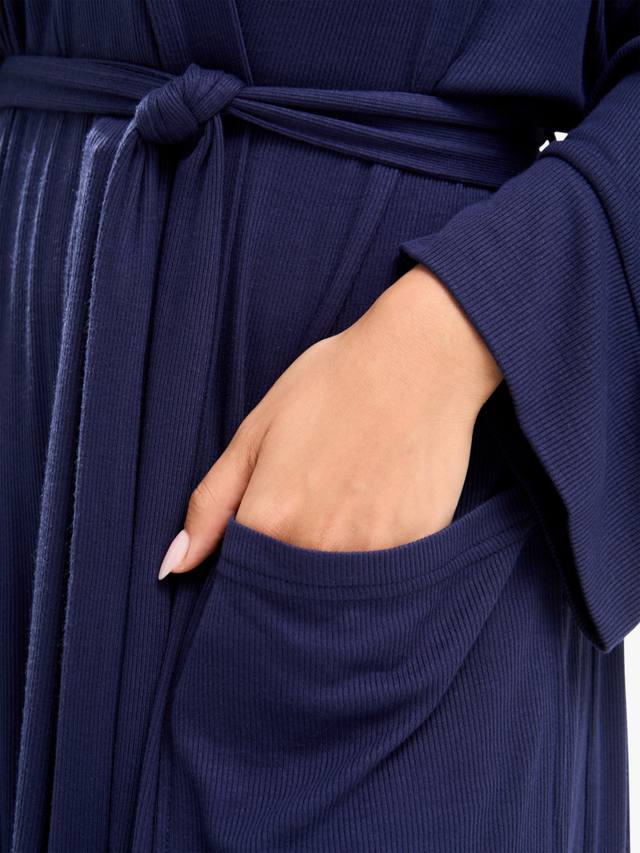 Длина халата чуть ниже колена обеспечивает идеальный баланс между защитой и удобством. Халат оснащен внутренней завязкой для дополнительной безопасности и внешней завязкой на талии для индивидуальной подгонки. Стандартный крой и супермягкая рубчатая ткань создают красиво драпирующийся силуэт, что делает его идеальным легким слоем для спокойного утра и уютного вечера.