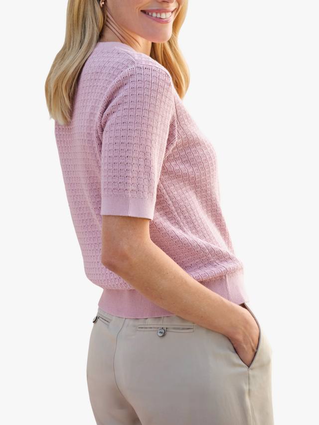 Хлопковый смарт-кардиган с V-образным вырезом, короткими рукавами и золотой отделкой на пуговицах создает четкие, чистые линии, придавая изделию нотку гламура.