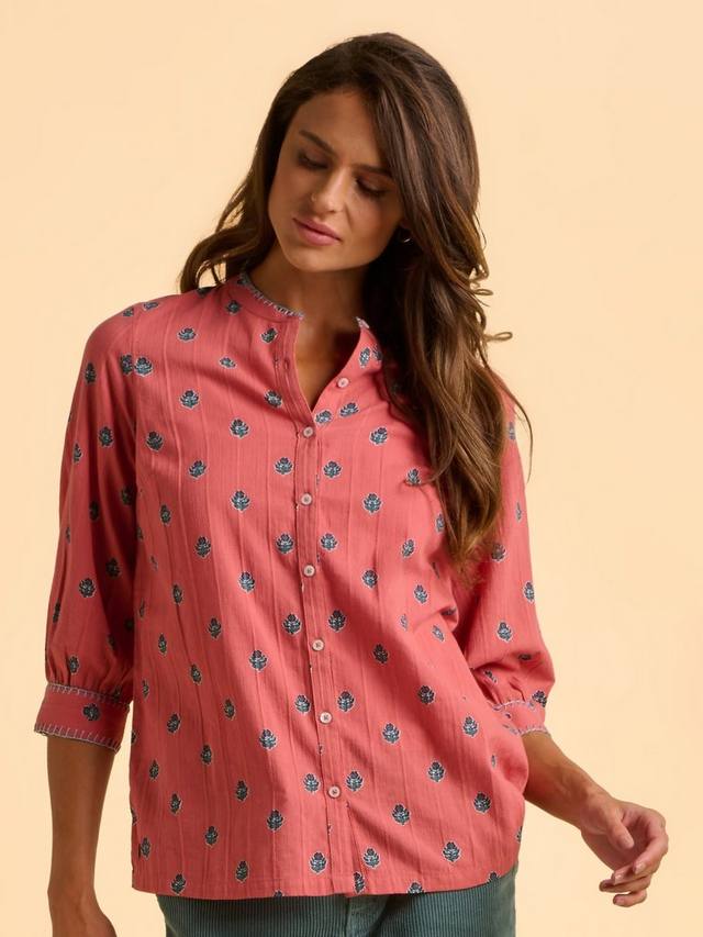 Блузка Sara легкая, яркая и очаровательная. Изготовлена из 100% хлопка с текстурированным цветочным принтом, имеет присборенные рукава ¾ с контрастной оверлочной строчкой и манжеты на двух пуговицах. Отделка перламутровыми пуговицами, изящными вытачками и боковыми разрезами — она идеально сочетается с вашим любимым светлым денимом.
