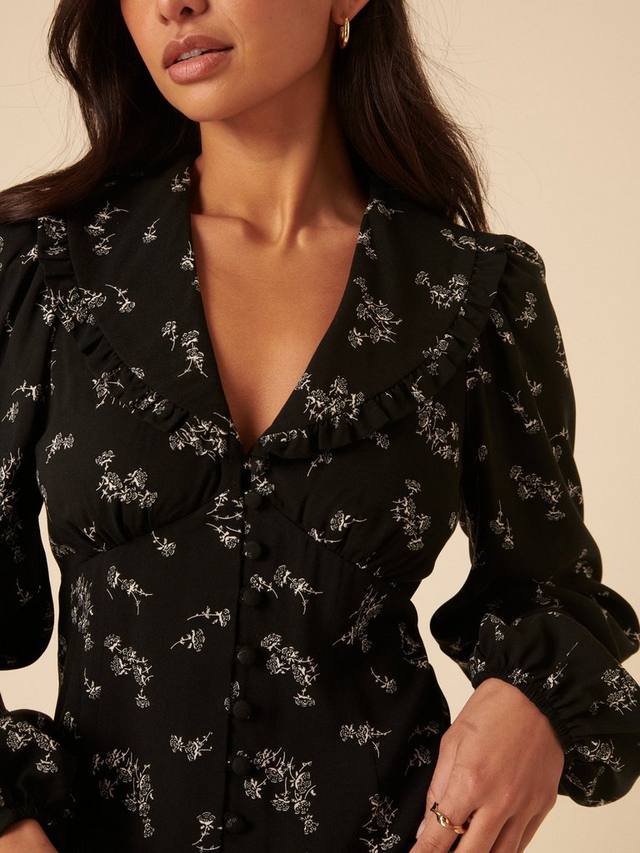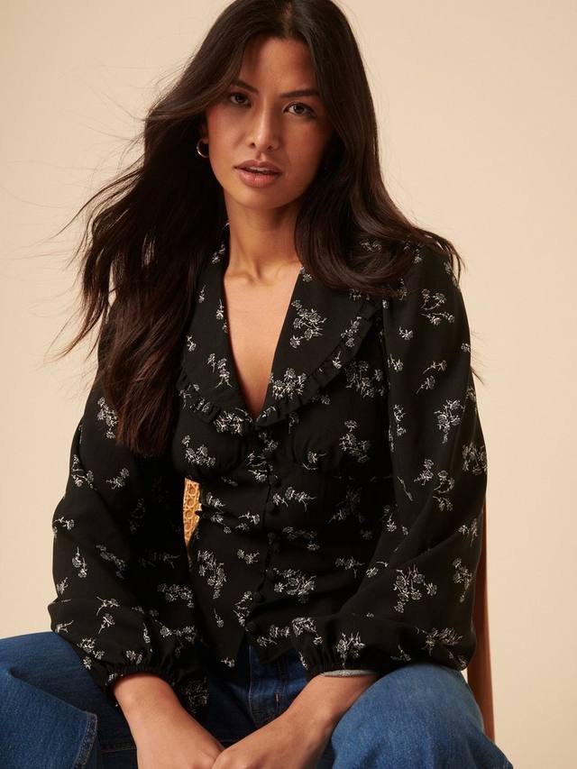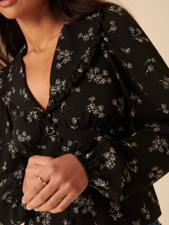Эта блузка никогда не надоест. Выполненная в классическом цветочном стиле, она отличается оборчатым воротником и красивой застёжкой на пуговицы спереди. Носите её с вашими любимыми джинсами.