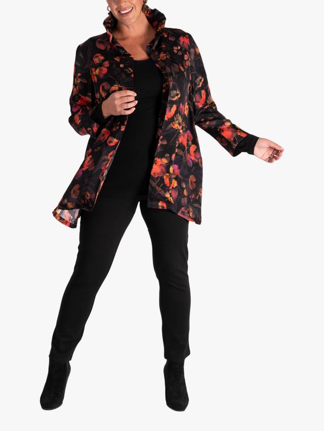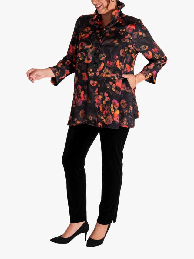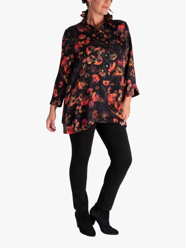 Выразите себя в этой тунике с эффектным цветочным принтом. Рукава с манжетами 3/4, два боковых кармана, пуговицы по бокам и воротник с оборкой из металлической проволоки — это эффектный повседневный образ, который можно носить с джинсами или черными строгими брюками.