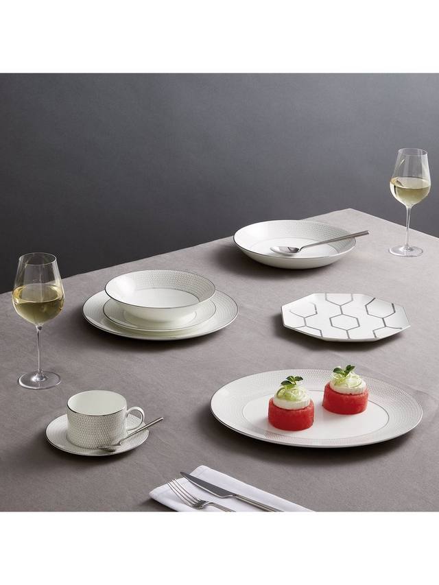 Столовая посуда Wedgwood Gio Platinum украшена металлическим геометрическим узором на белом тонком костяном фарфоре. Эта чайная тарелка из этой серии отличается современным дизайном и легко моется в посудомоечной машине. Сочетайте ее с другими коллекциями Wedgwood, чтобы освежить свою посуду.