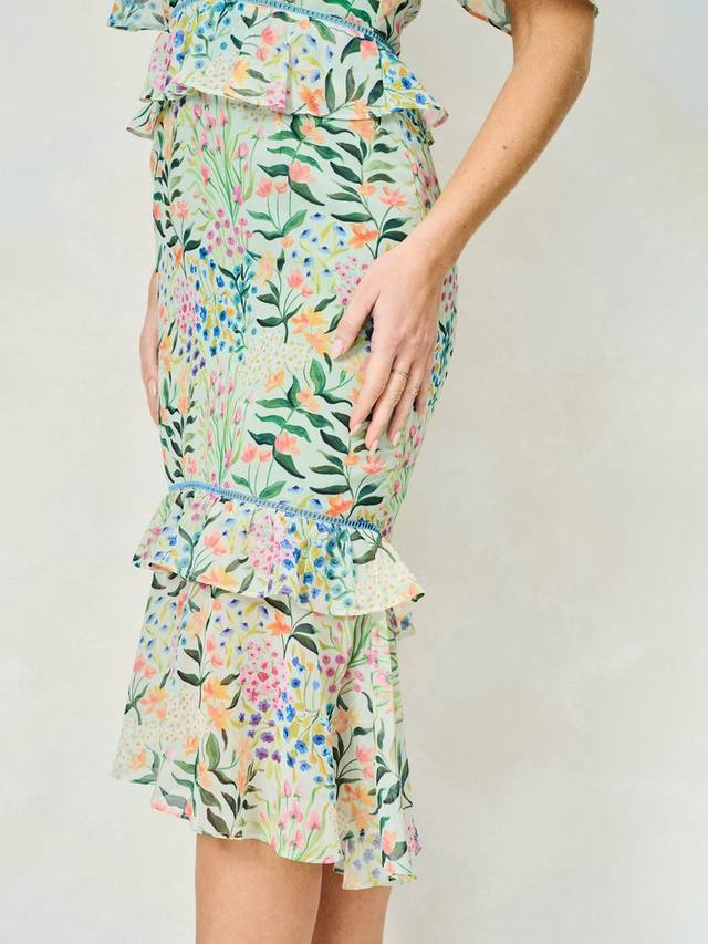 Это платье из коллекции Hope & Ivy Responsible Edit на 100% изготовлено из переработанных материалов — маленькие шаги приводят к большим переменам. Классическое чайное платье — незаменимая вещь в вашем гардеробе, а модель Karina украшена живописным цветочным узором на бледно-зелёной основе. V-образный вырез и баска на талии создают эффектный силуэт, дополняемый многоярусной юбкой с оборками длиной до середины голени. Дополните его босоножками и клатчем для особого случая. Что бы вы ни делали, в этой потрясающей вещи вы гарантированно очаруете окружающих.