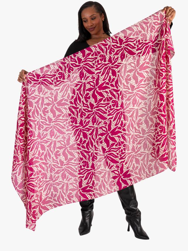 Этот мягкий на ощупь шарф с цветочным принтом контрастных оттенков фуксии и кремового цвета мгновенно оживит любой наряд. Он станет отличным способом добавить ярких красок в ваш образ. Этот яркий и лёгкий шарф с прямым краем станет идеальным акцентом для ваших весенне-летних образов. Примерные размеры: длина 180 см, ширина 100 см.