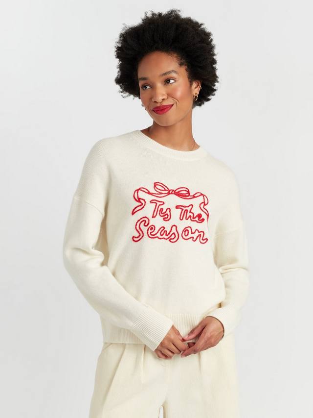 Поднимите себе настроение с этим элегантным рождественским джемпером из роскошной мягкой смеси шерсти и кашемира. Этот элегантный рождественский джемпер, украшенный очаровательным бантом и инкрустацией, станет идеальным выбором для праздничного настроения и уютных вечеринок.
