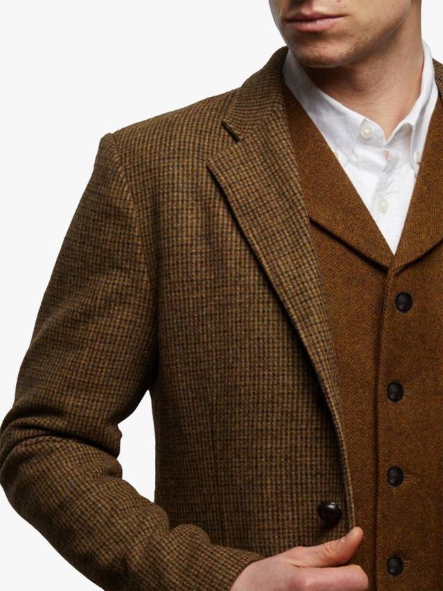 Жилет Sherwood воплощает вечную британскую элегантность и идеально сочетается с твидовым блейзером Allenby того же бренда. Этот однобортный силуэт также выполнен из чистой шерсти и застегивается на пять пуговиц.