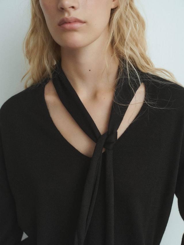 Тонкий трикотажный джемпер с добавлением шерсти для дополнительного тепла. Завязка на вороте добавляет современный штрих, а длинные рукава обеспечивают комфорт. Он лёгкий, мягкий и идеально подходит для многослойной одежды в повседневной жизни.
