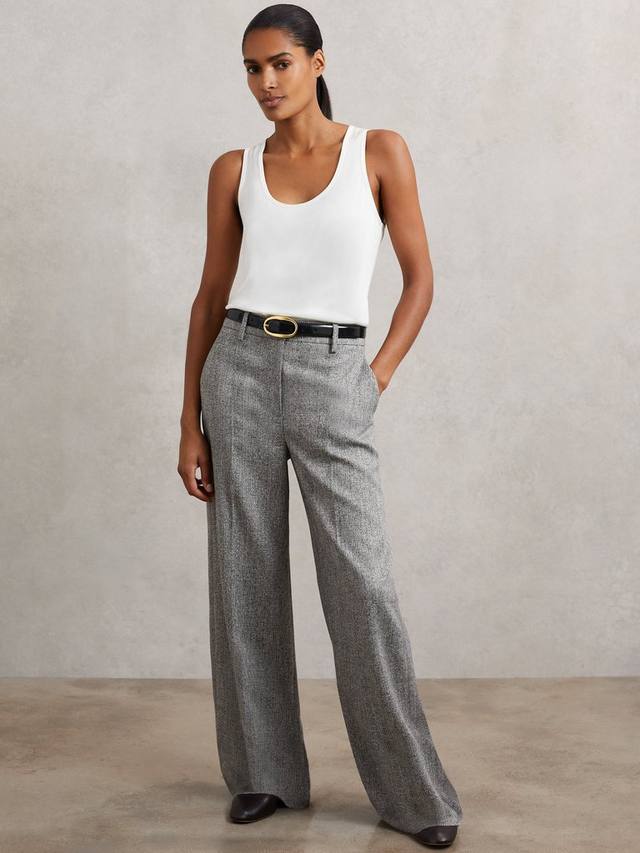 Эти брюки от Reiss отличаются смелым силуэтом и широкими штанинами. Они имеют среднюю посадку, застежку-молнию, клетчатый принт и удлиненную длину.