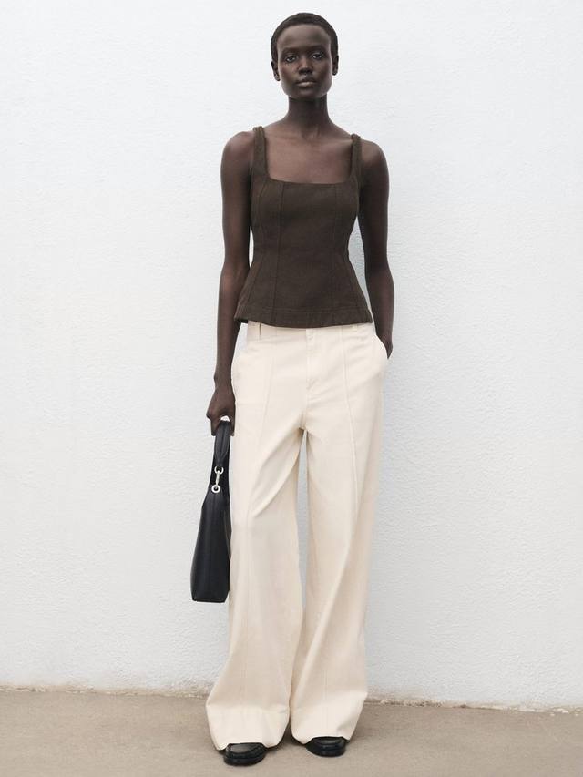 Сдержанный объём и строгий крой — широкие брюки Mango из чистого хлопка. Средняя посадка, застёжка на пуговицу и молнию.