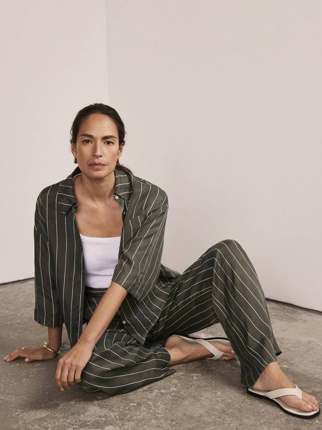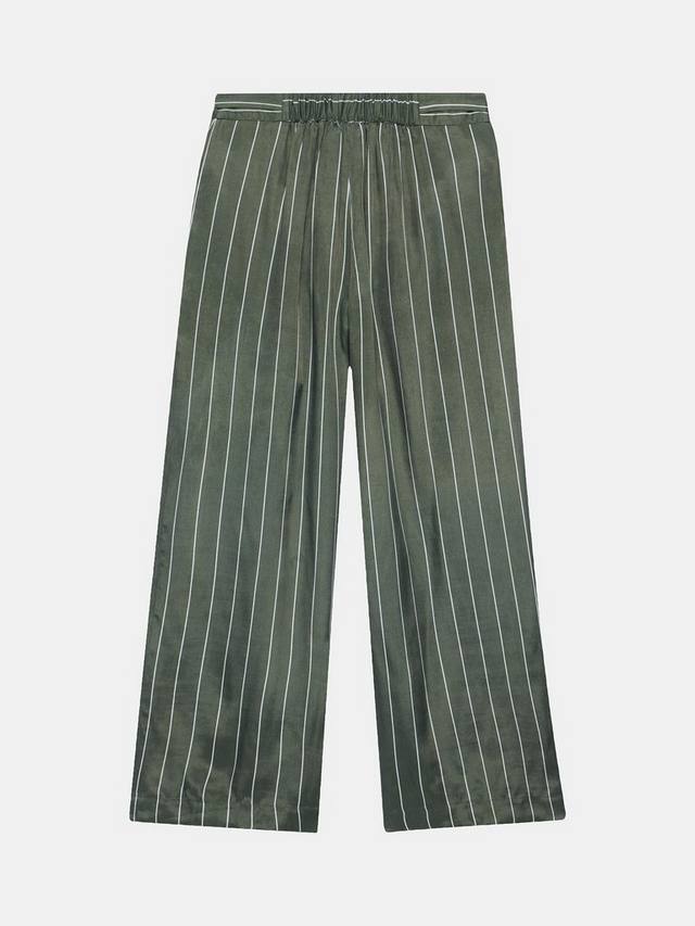 Пара полосатых брюк цвета хаки с высокой посадкой, широкими штанинами и затягивающимся шнурком спереди.