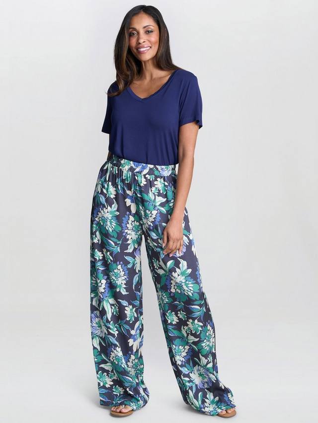 Украсьте свой повседневный стиль атласными брюками Quinn от Gina Bacconi. Эти шикарные брюки с цветочным принтом, широкими штанинами и эластичным поясом обеспечивают свободную посадку.