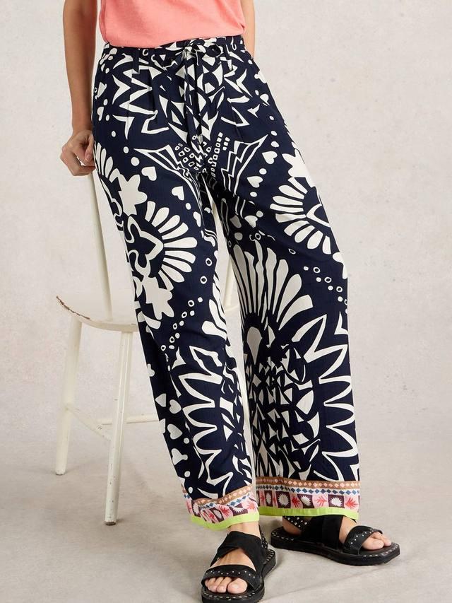 Пара легких брюк широкого кроя с завязками на талии и каймой по подолу.