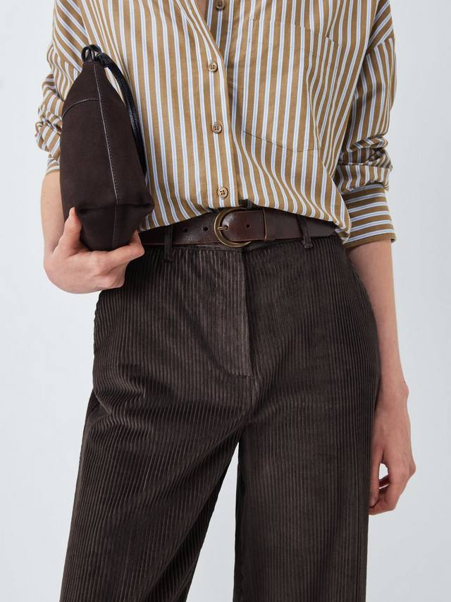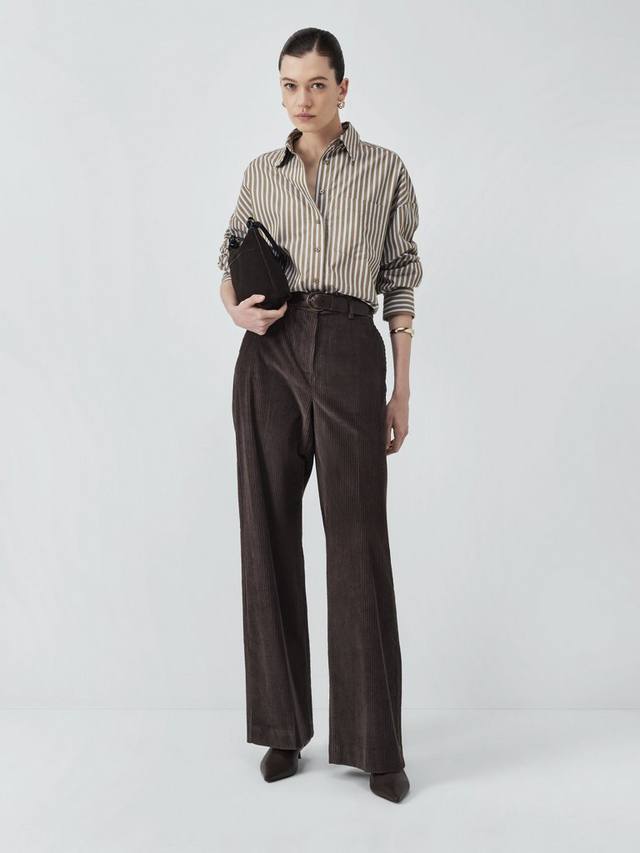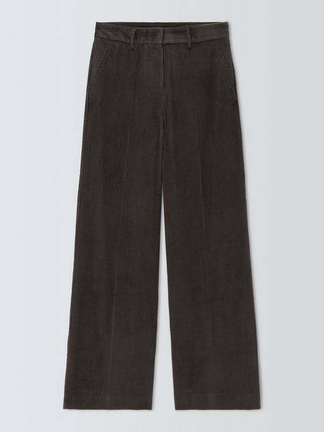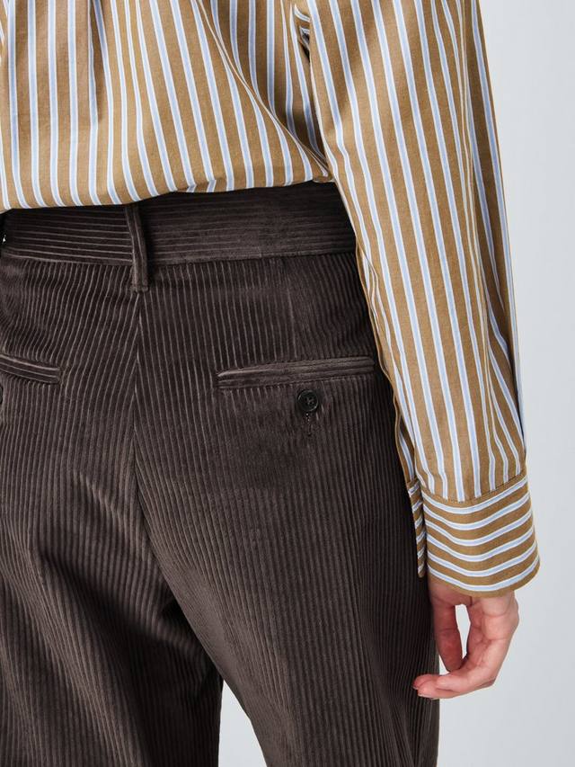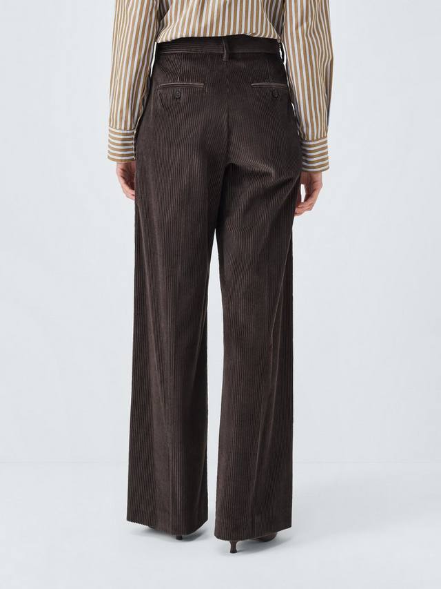 Длинные брюки с характерным широким силуэтом. Изготовлены из хлопкового вельвета с девятью рубчиками, с широким поясом, застежкой на молнию и маленький крючок. С косыми карманами по бокам, прорезными карманами сзади, шлевками для ремня и стрелками.