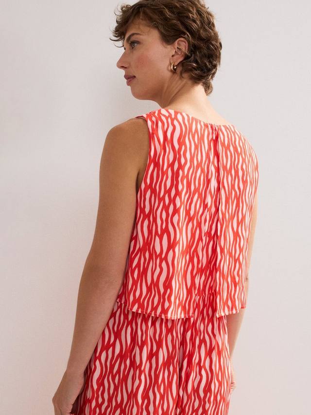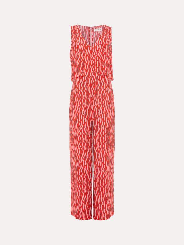 Комбинезон Loren, создающий иллюзию стильного костюма-двойки, — универсальная модель, которая станет отличным дополнением к вашему гардеробу. Абстрактный красный принт добавляет выразительности и плавно переходит в удобный свободный силуэт. В сочетании с балетками или каблуками этот стиль легко перенесет вас с дня на вечер.