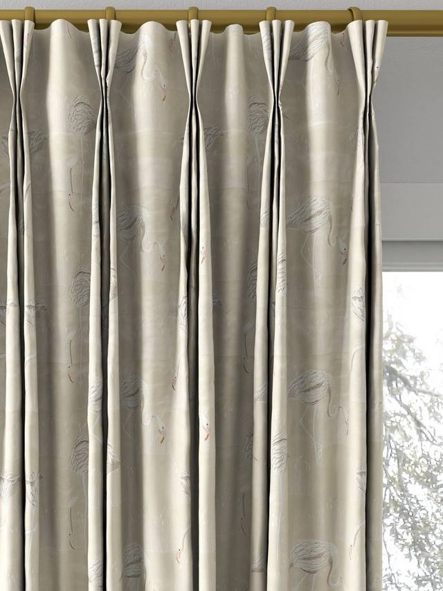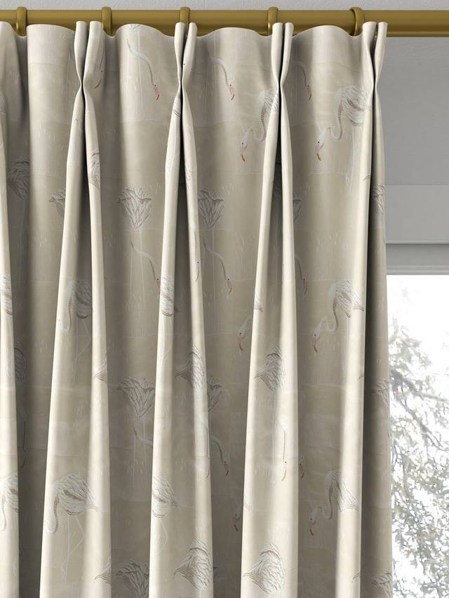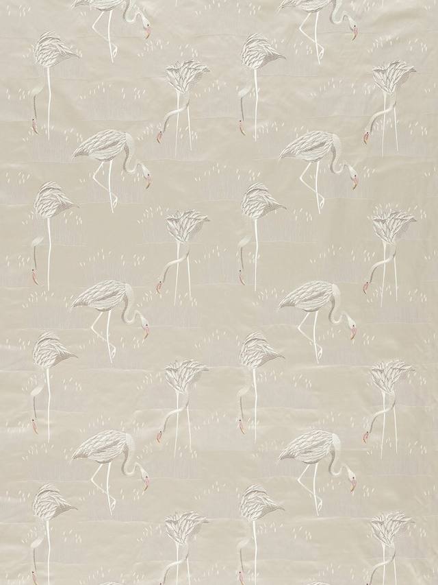 Фламинго, изящно плещущиеся в мелководье, изображены на ткани Salinas от Harlequin, их вышитые крылья демонстрируют изысканные детали.