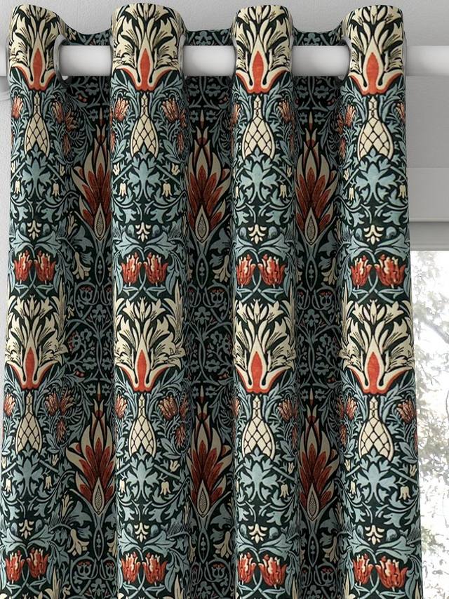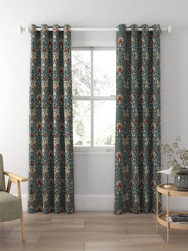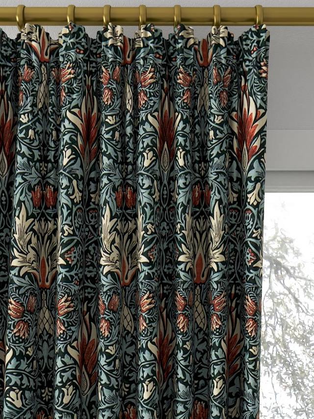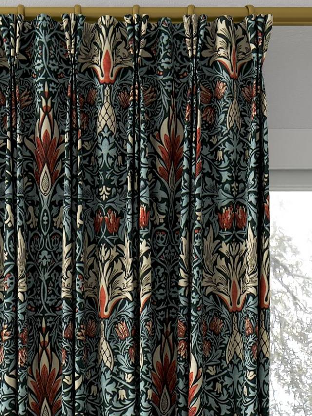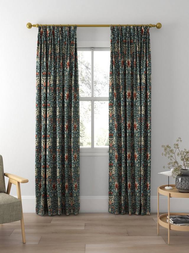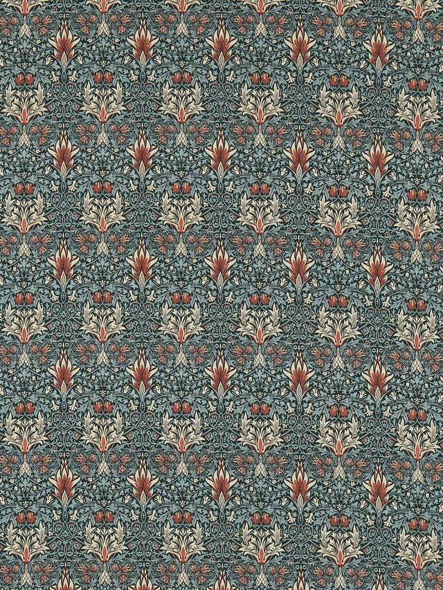 Ткань Змеиная голова от Morris & Co. украшена эффектным узором, напоминающим пламя, с острыми пучками листьев и вьющимися завитками.