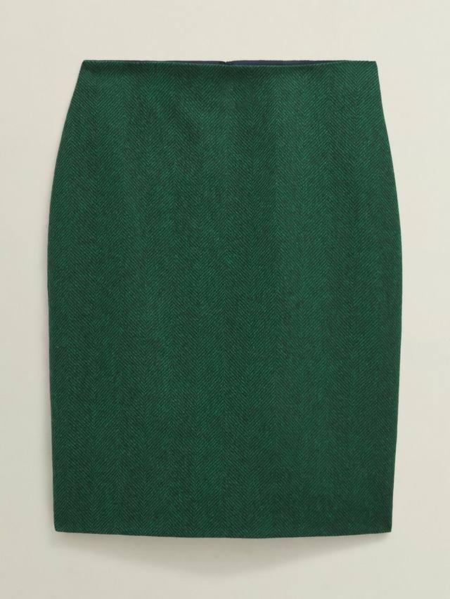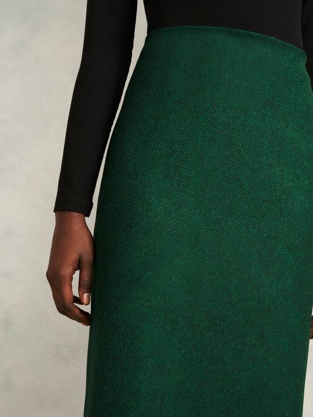 Эта юбка с продуманным кроем, длиной до колена, предоставлена Hobbs. Удобный А-силуэт выполнен из чистой шерсти и украшен узором ёлочка.