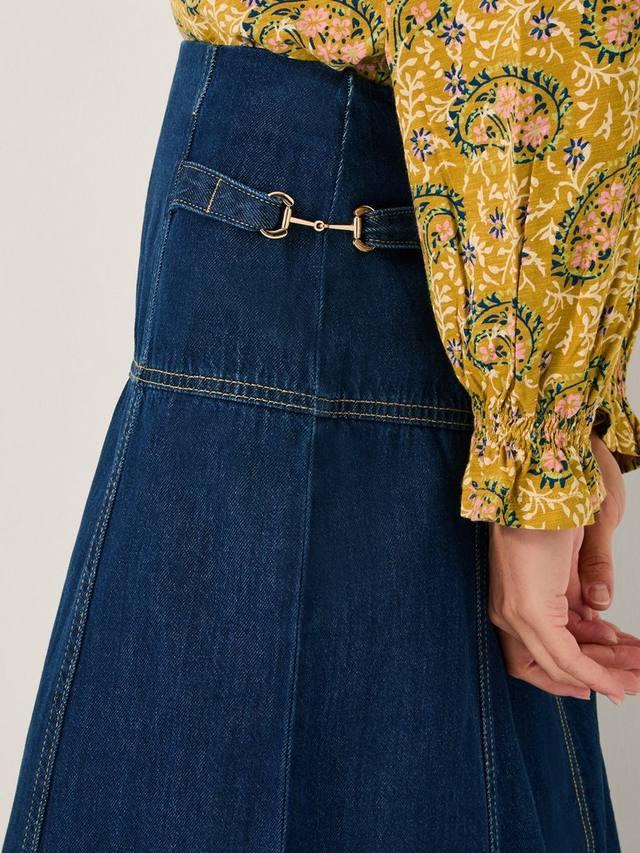 Эта джинсовая юбка длиной миди переходит в А-силуэт с табачной строчкой. Летом её можно носить с блузкой и сандалиями, а осенью — с высокими сапогами и блузкой. Дополнена пряжками в стиле наездника по бокам.