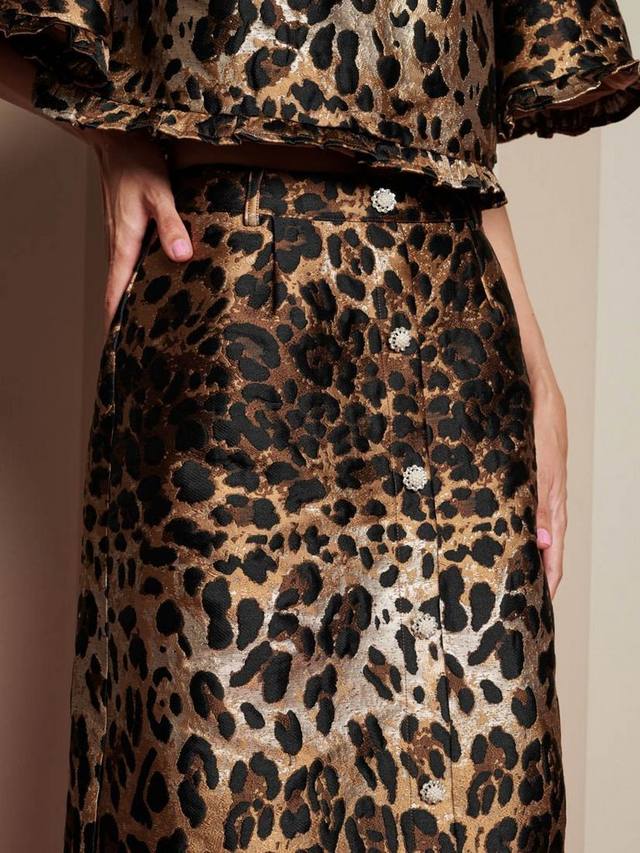 Юбка миди из жаккардовой ткани с леопардовым принтом и металлическими деталями. Высокая талия, декоративная отделка пуговицами из жемчуга и драгоценных камней.