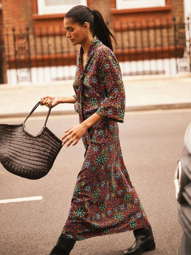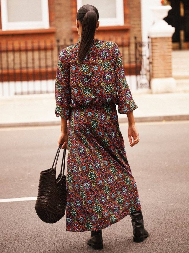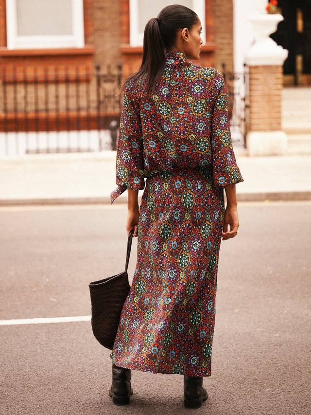 Универсальный А-силуэт косого кроя из фирменного шелкового крепдешина. Эксклюзивный принт с каждым оттенком осени — накиньте на него объемный свитер и ботинки. Готово.