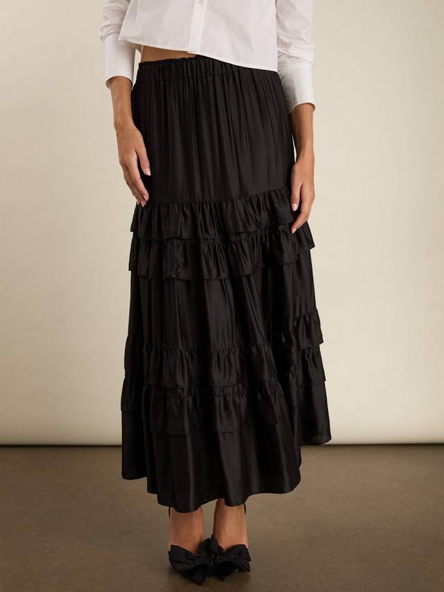 Наряд жужж — это просто юбка-макси Angelica с оборками! Эта атласная модель легко надевается и обещает добавить драматизма в любой образ, сочетая её с простыми футболками, однотонным трикотажем и классическими белыми рубашками. Юбка состоит из многоярусных секций, украшенных щедрыми оборками, и идеально подходит для вечеринки. Благодаря эластичному поясу она одновременно удобная и общительная.