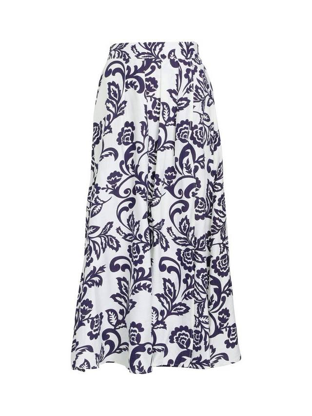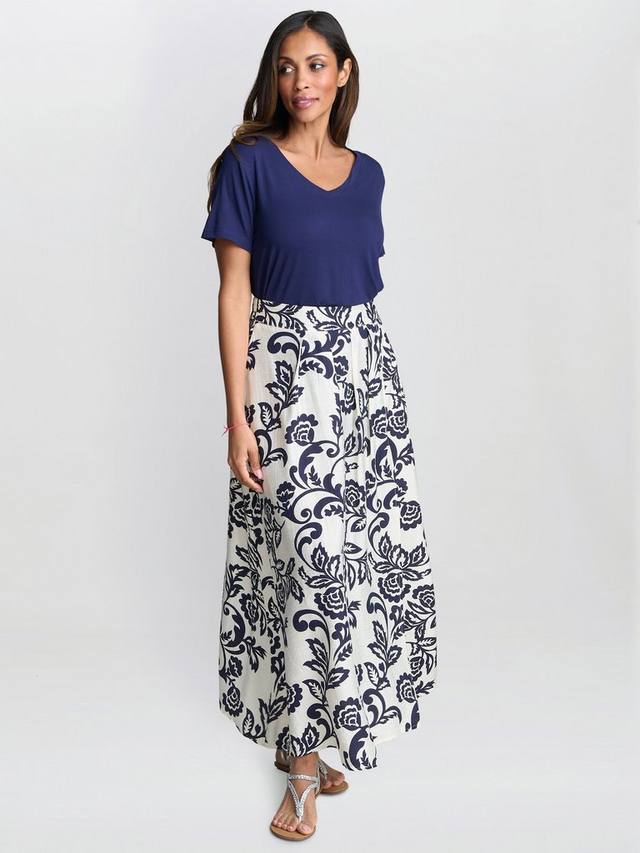 Эта удобная, надеваемая юбка с цветочным принтом и эластичной талией, имеет боковой разрез и складки на талии. Отлично сочетается с простой темно-синей футболкой. Юбка без подкладки.