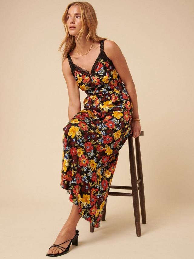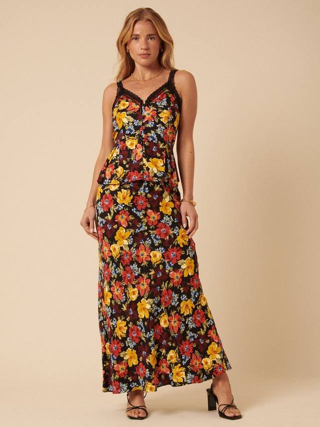Юбка макси с цветочным принтом по всей поверхности. Высокая талия и А-образный силуэт облегают фигуру благодаря струящейся ткани.