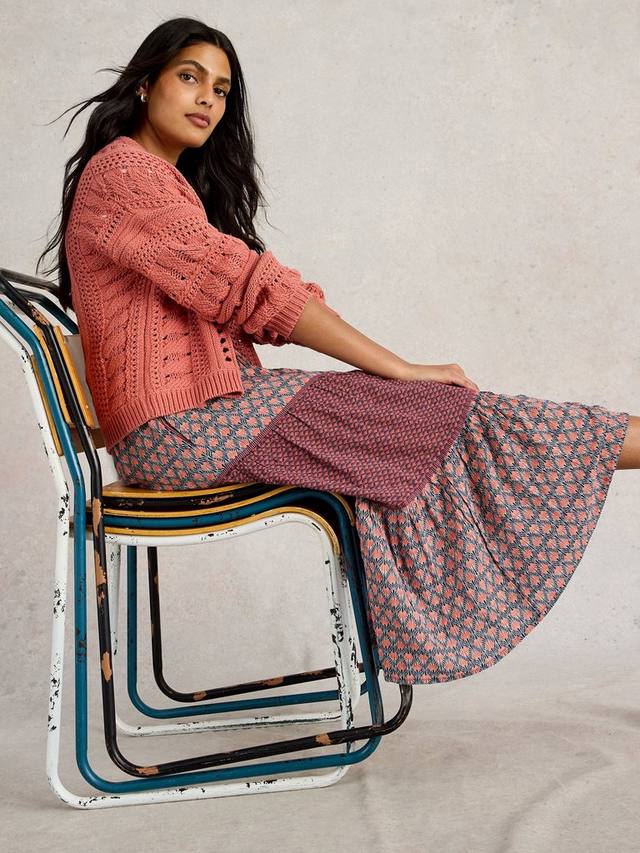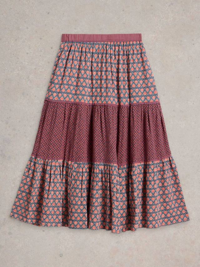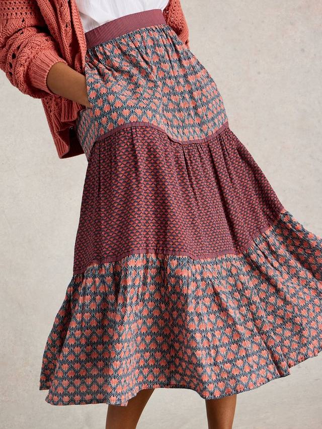 Эта юбка миди от White Stuff, многоярусная по профилю, украшена эффектным абстрактным принтом.
