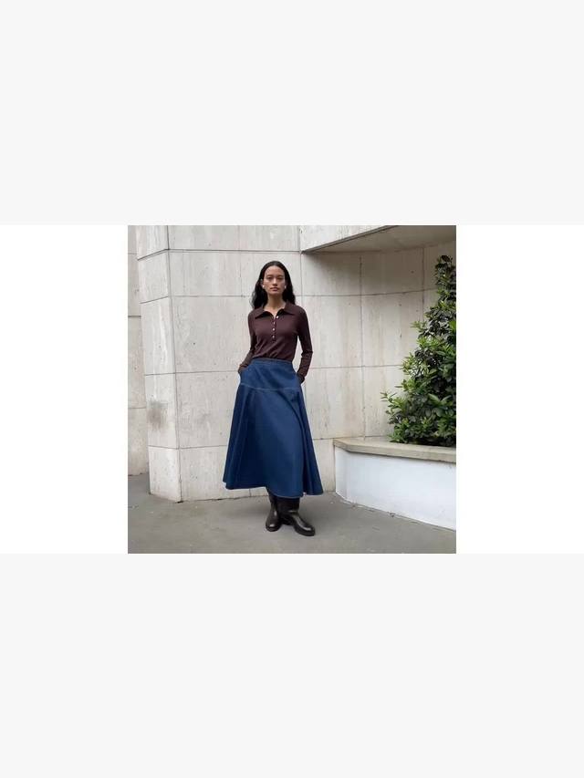 Эта джинсовая юбка миди с глубоким приталенным поясом и подчеркивающим фигуру А-силуэтом выполнена из контрастной ткани сверху, имеет открытую молнию сзади и боковые карманы.