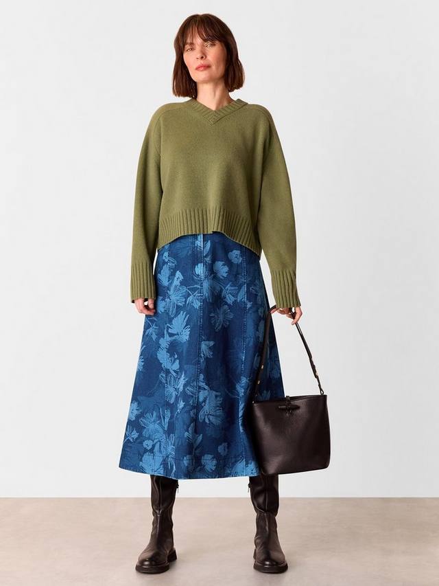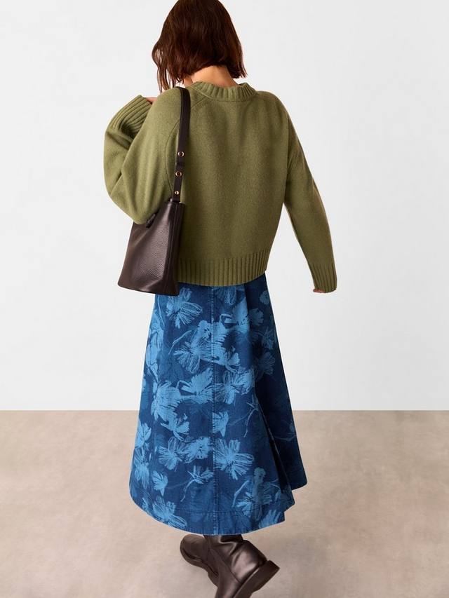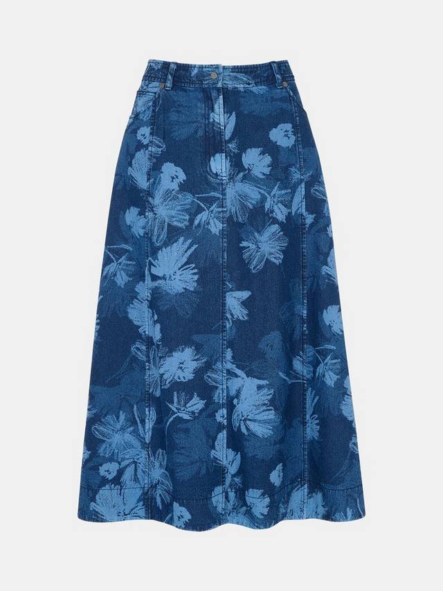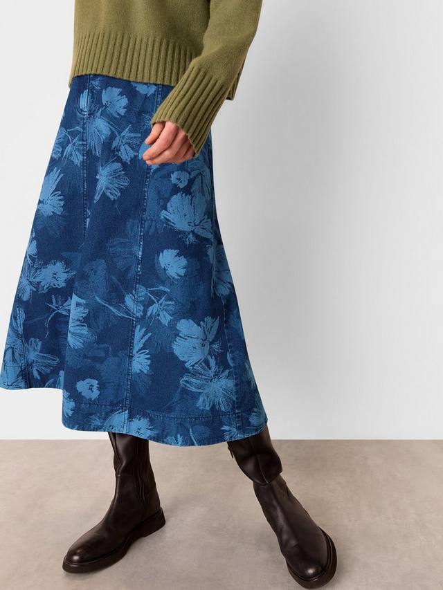 Эта джинсовая юбка миди от Whistles, вдохновленная чистым силуэтом, украшена цветочным принтом в тон.
