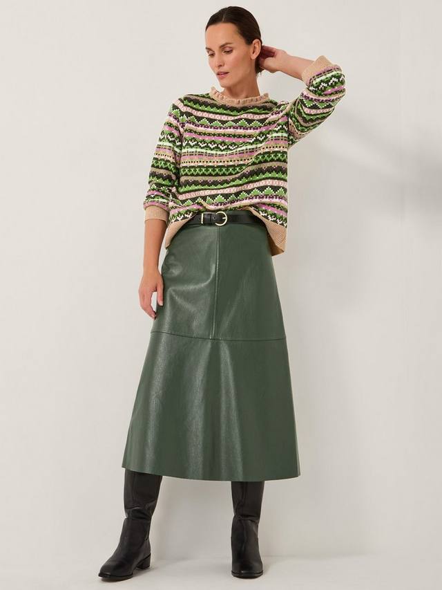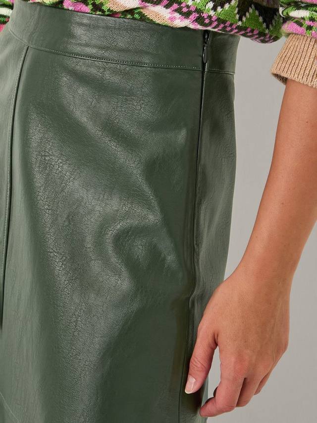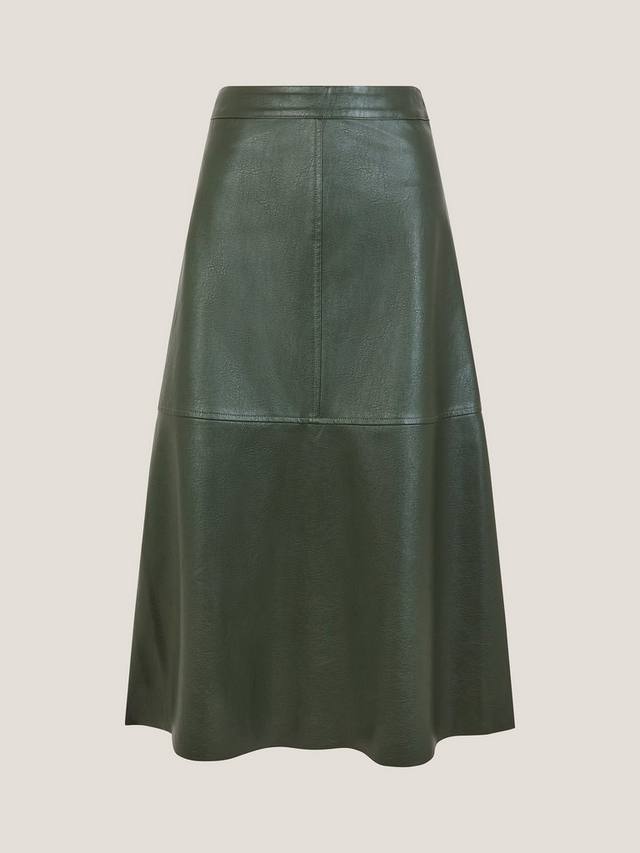 Элегантная юбка миди из мягкой искусственной кожи. Модель А-силуэта оливково-зелёного оттенка.