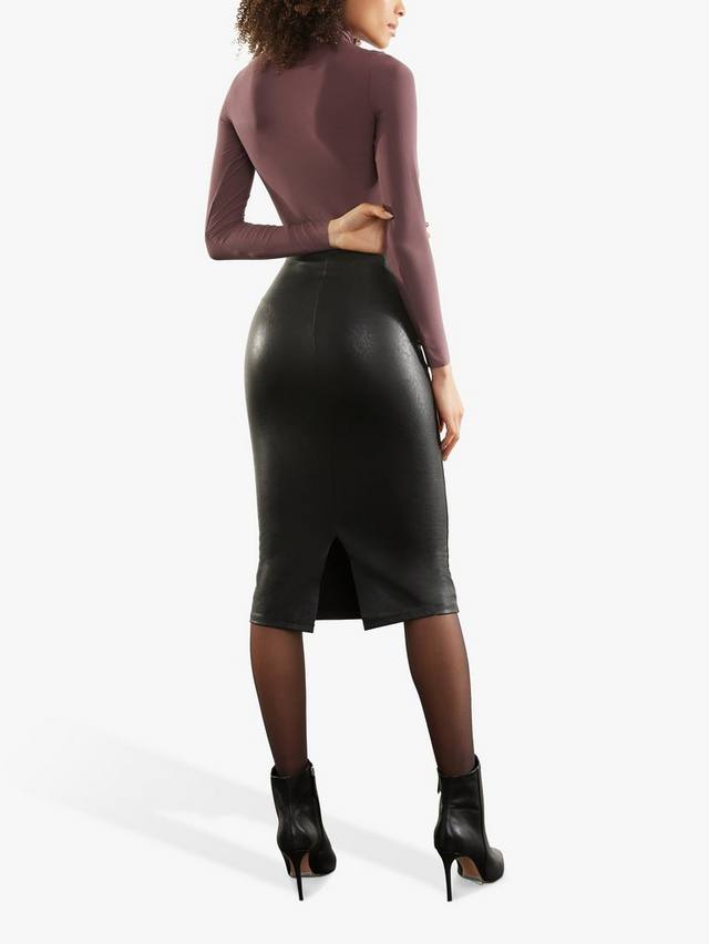 Юбка миди из искусственной кожи изготовлена из любимой поклонниками бренда искусственной кожи Commando. Благодаря 4-сторонней эластичности, необработанным краям и фирменному сглаживающему внутреннему поясу эта юбка миди из искусственной кожи удобна, элегантна и невероятно подчеркивает фигуру. Юбка может показаться обтягивающей при первом надевании, но она примет форму уже после первой примерки. Поверьте, это того стоит!