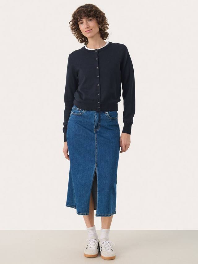 Юбка миди из денима А-силуэта от Part Two обеспечивает простой повседневный стиль благодаря практичным карманам и мягкой эластичности для комфорта.