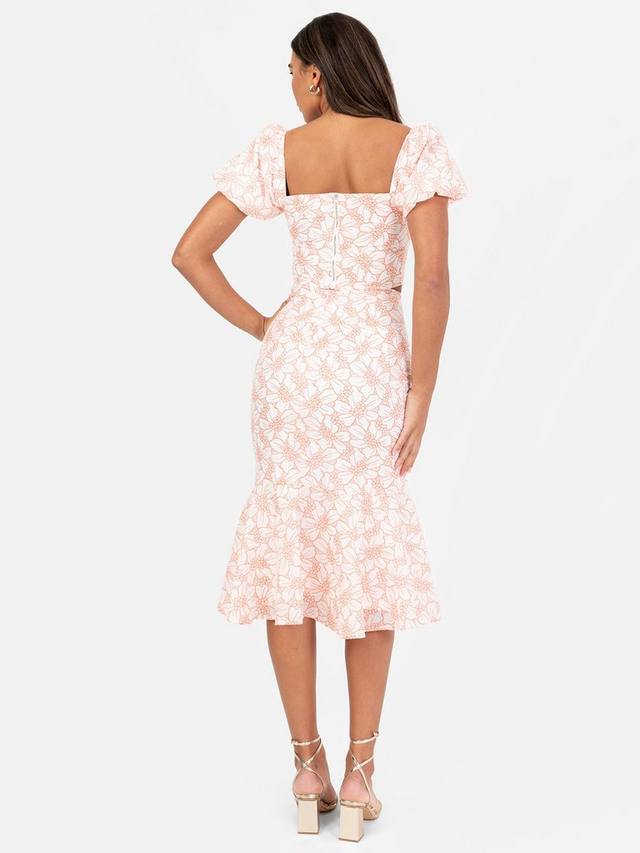 Элегантность сочетается с современным шармом в этом потрясающем цветочном комплекте. Лиф, призванный произвести впечатление, отличается шикарным квадратным вырезом и короткими рукавами-буфами, которые придают ему немного драматизма. Приталенная юбка миди красиво облегает ваши изгибы, прежде чем перейти в изящный баску.