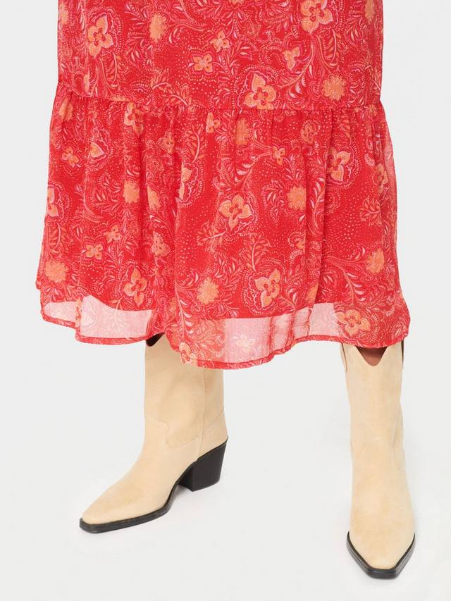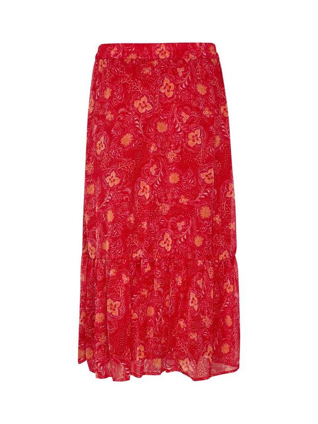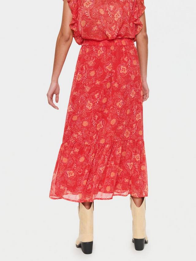 Эта юбка миди А-силуэта из Сен-Тропе, подчеркнутая ярусами, ниспадающими по ее профилю, украшена цветочными узорами.