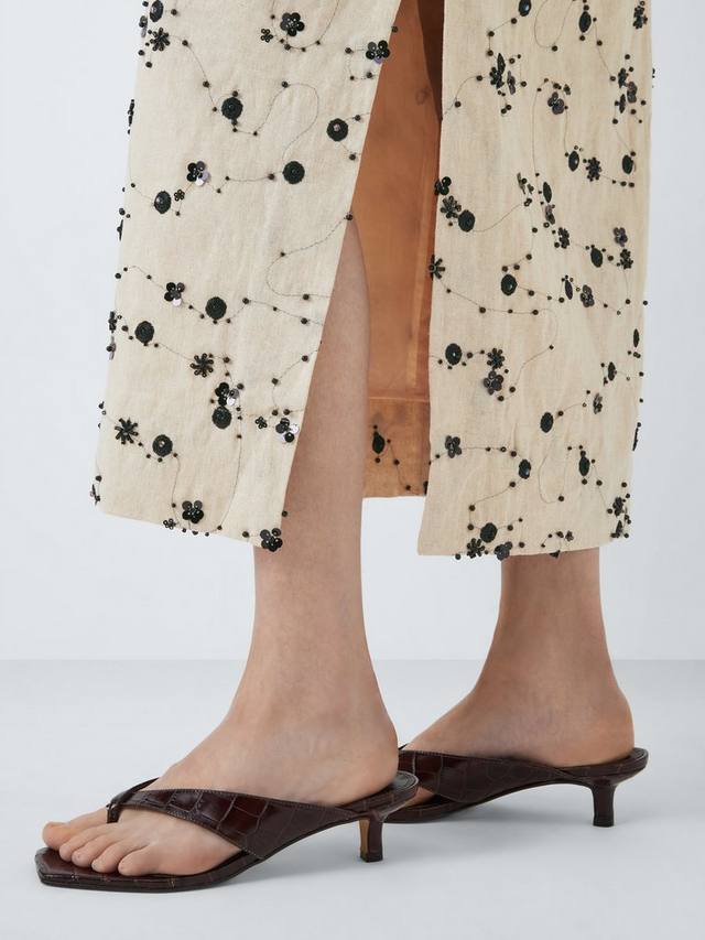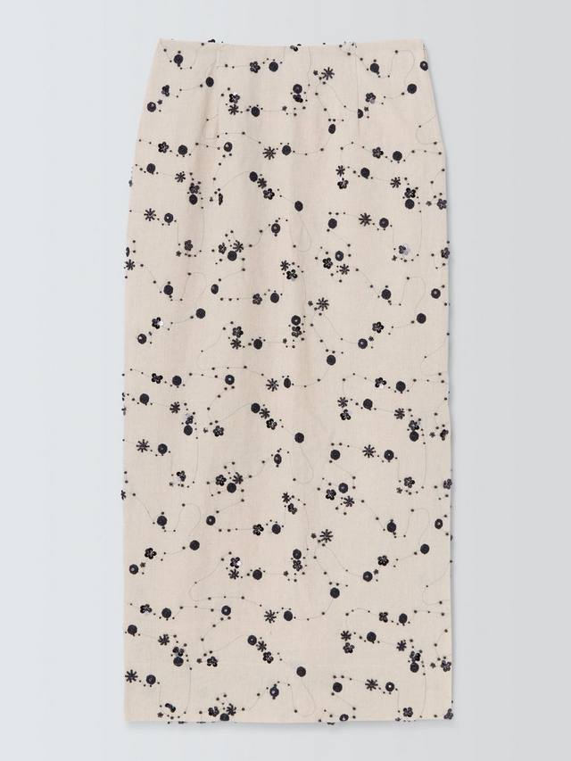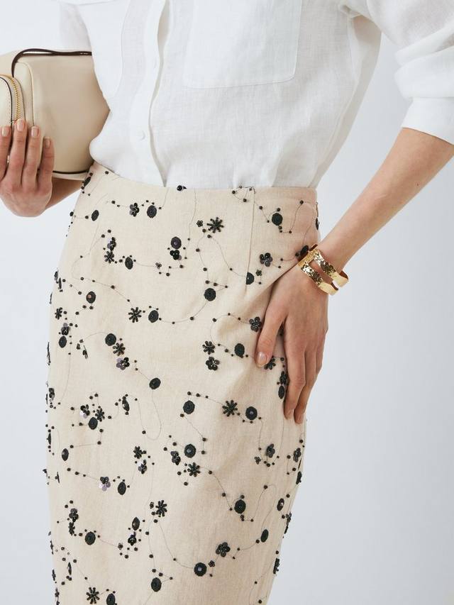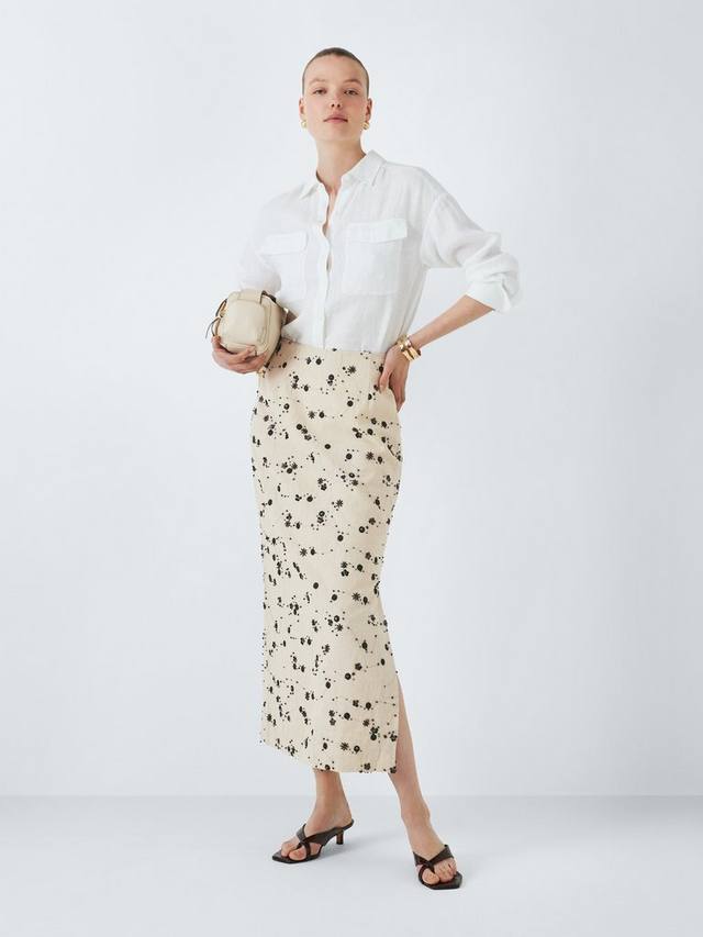 Юбка-карандаш миди с абстрактными деталями. Изготовлена из лёгкой ткани с добавлением льна для комфорта в тёплую погоду.
