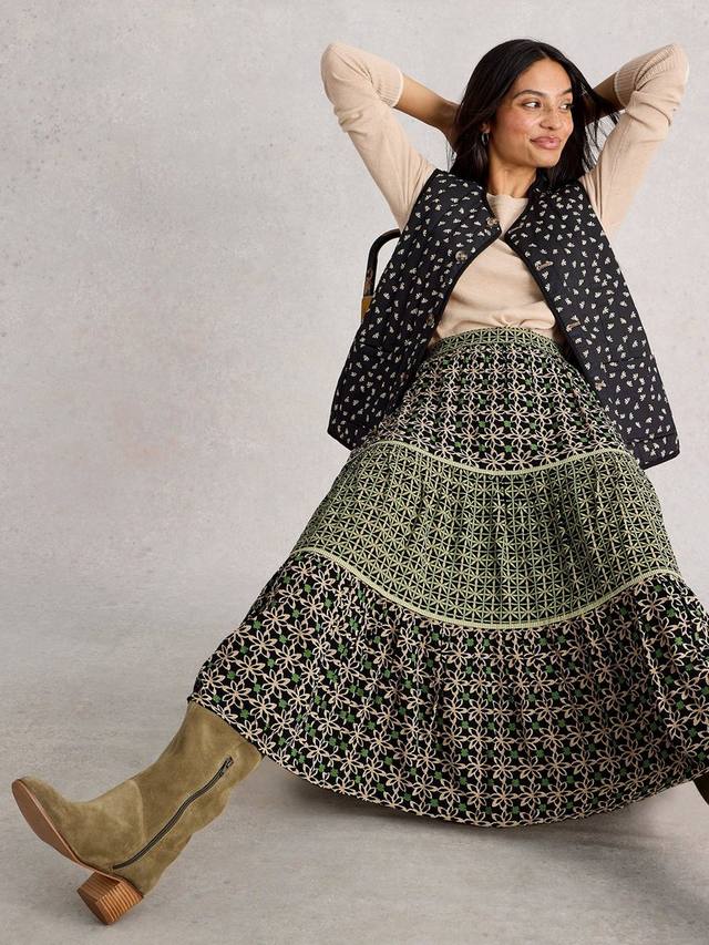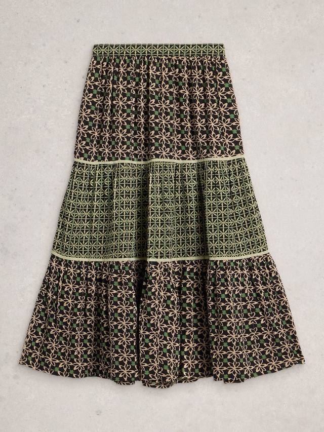 Эта удобная модель от White Stuff отличается миди-низом. Многоуровневый А-силуэт выполнен из вискозы и дополнен геометрическим принтом по всей поверхности.