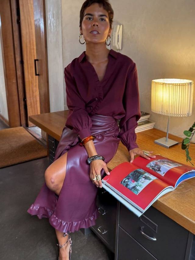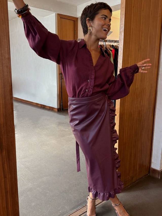 Эта юбка из искусственной кожи украшена оборками по бокам и нижнему краю, а также имеет талию с запахом, которая завязывается несколькими способами.
