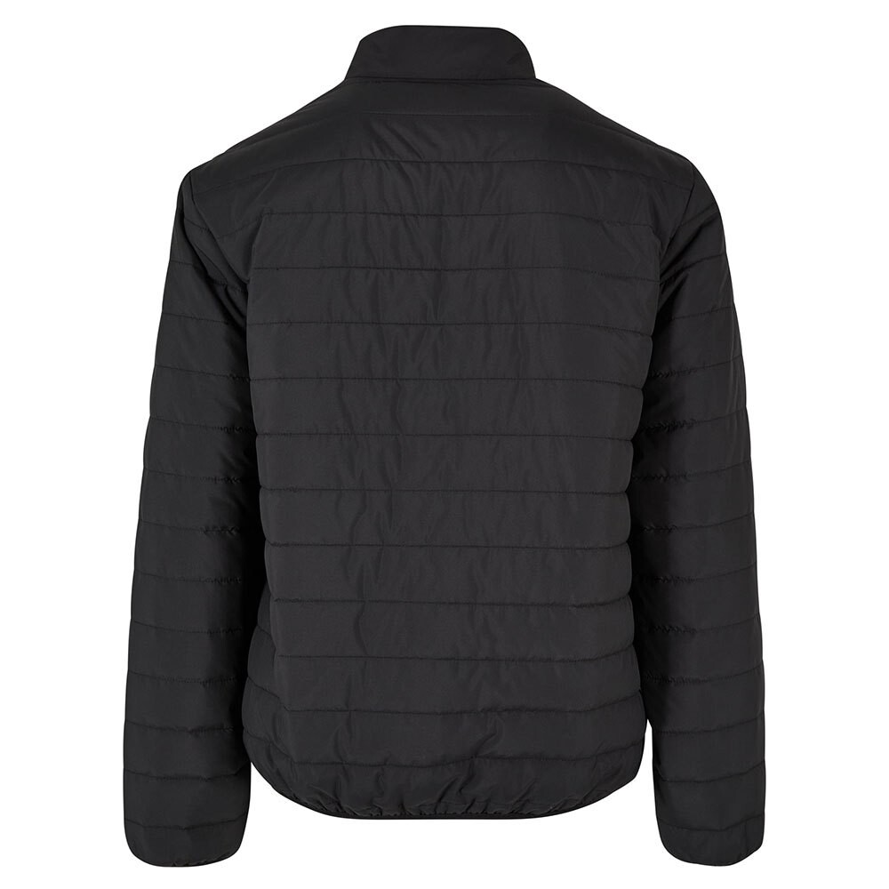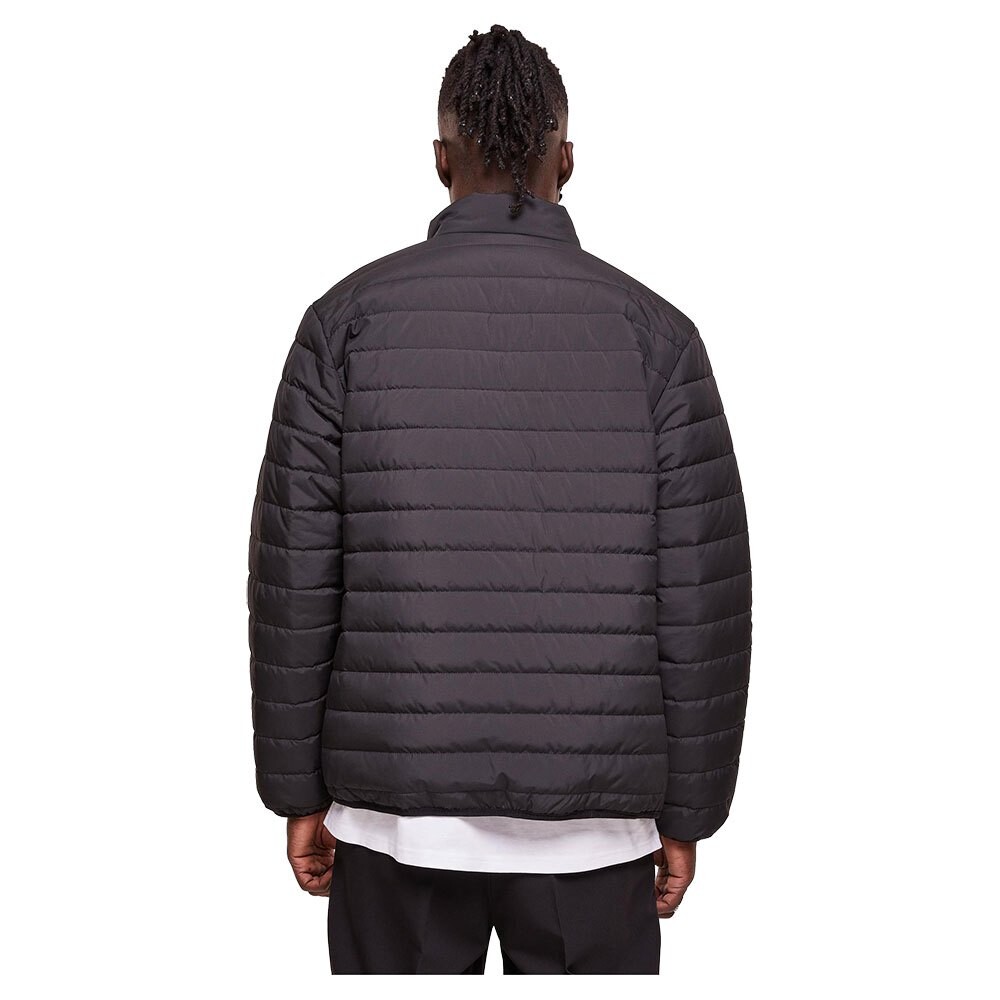 Пуховик застегивается на молнию и имеет на груди нашивку с логотипом Urban Classics в тон.
