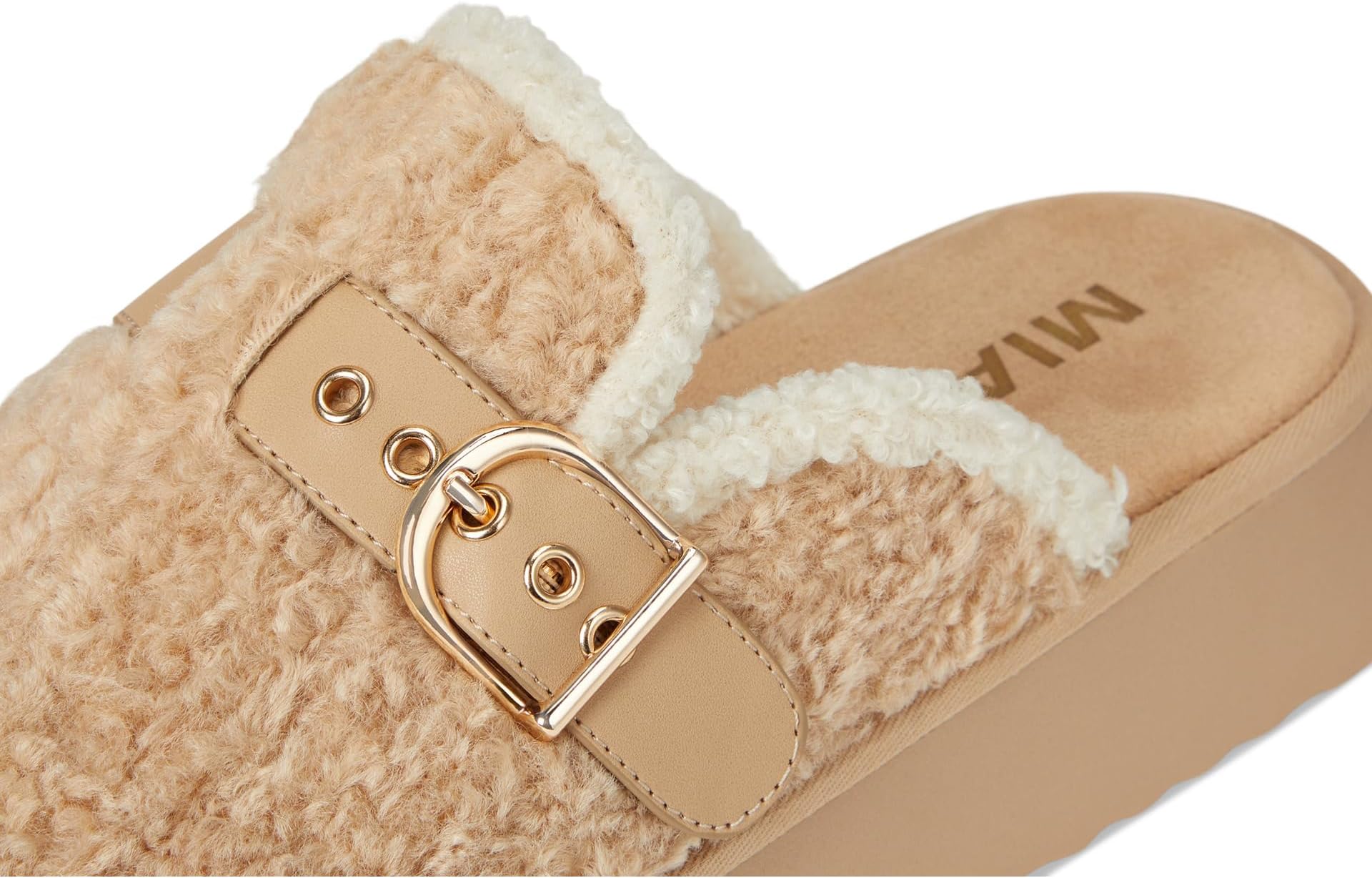 • Почувствуйте себя собранным и уютным с MIA Sugary-S. Эти мюли на платформе, выполненные из искусственной овчины и подбитые мягким плюшем, также имеют блестящую пряжку для шикарного образа.