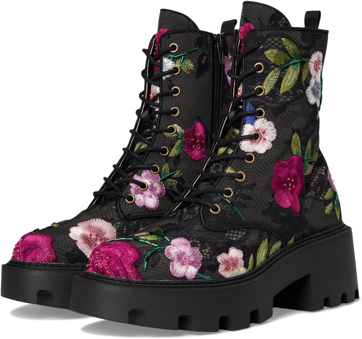 • Ботинки Blue от Betsey Johnson Polli с рифленой резиновой подошвой и цветочной вышивкой по всей поверхности – идеальный выбор для стильных девушек. Эти высокие ботинки до щиколотки изготовлены из полиуретановой стельки и полиэстеровой подкладки. Верх из полиэстера дополнен шнуровкой для надежной посадки. Застежка на молнии сбоку и язычок на пятке позволяют легко надевать и снимать обувь.
