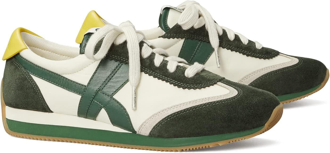 • Летние образы легко сочетаются с кроссовками Tory Burch Hank со спортивным полосатым дизайном, шнуровкой по всей длине и круглым носком.