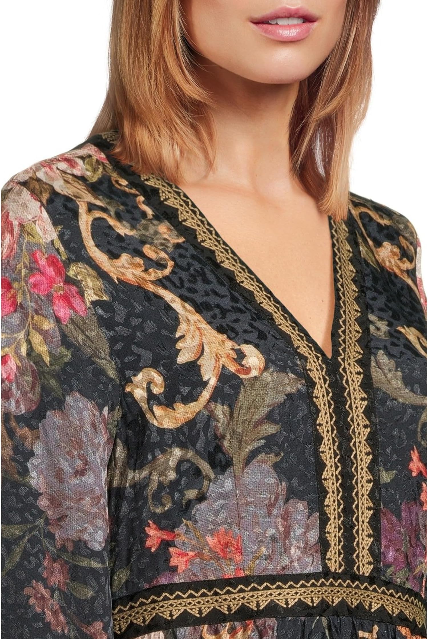 • Романтичное платье-миди с цветочным принтом, вышитыми деталями и классическим силуэтом в стиле бохо. V-образный вырез, рукава три четверти, свободный крой.