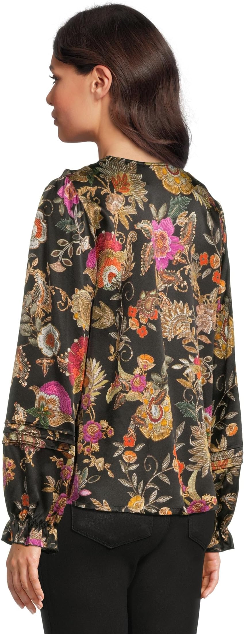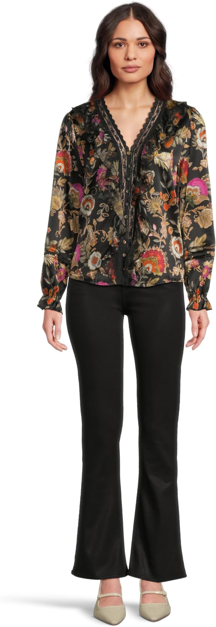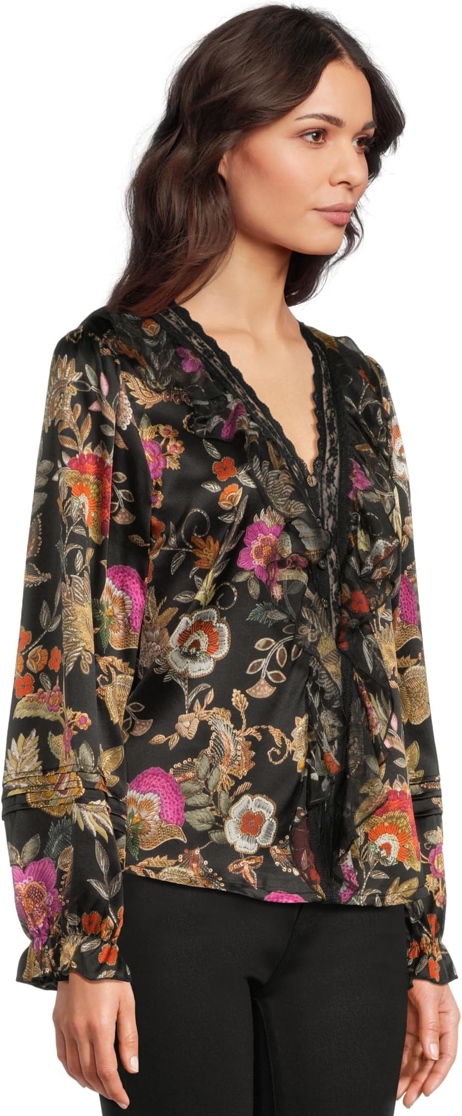 • Романтичная и изысканная блузка Johnny Was Claudia от Lowri украшена яркими цветочными узорами на темном фоне. Украшенная фестончатой отделкой V-образного выреза и длинными рукавами, она добавляет элегантности своему непринужденному силуэту. Универсальная модель идеально подходит для сочетания с джинсами или вечерних выходов.