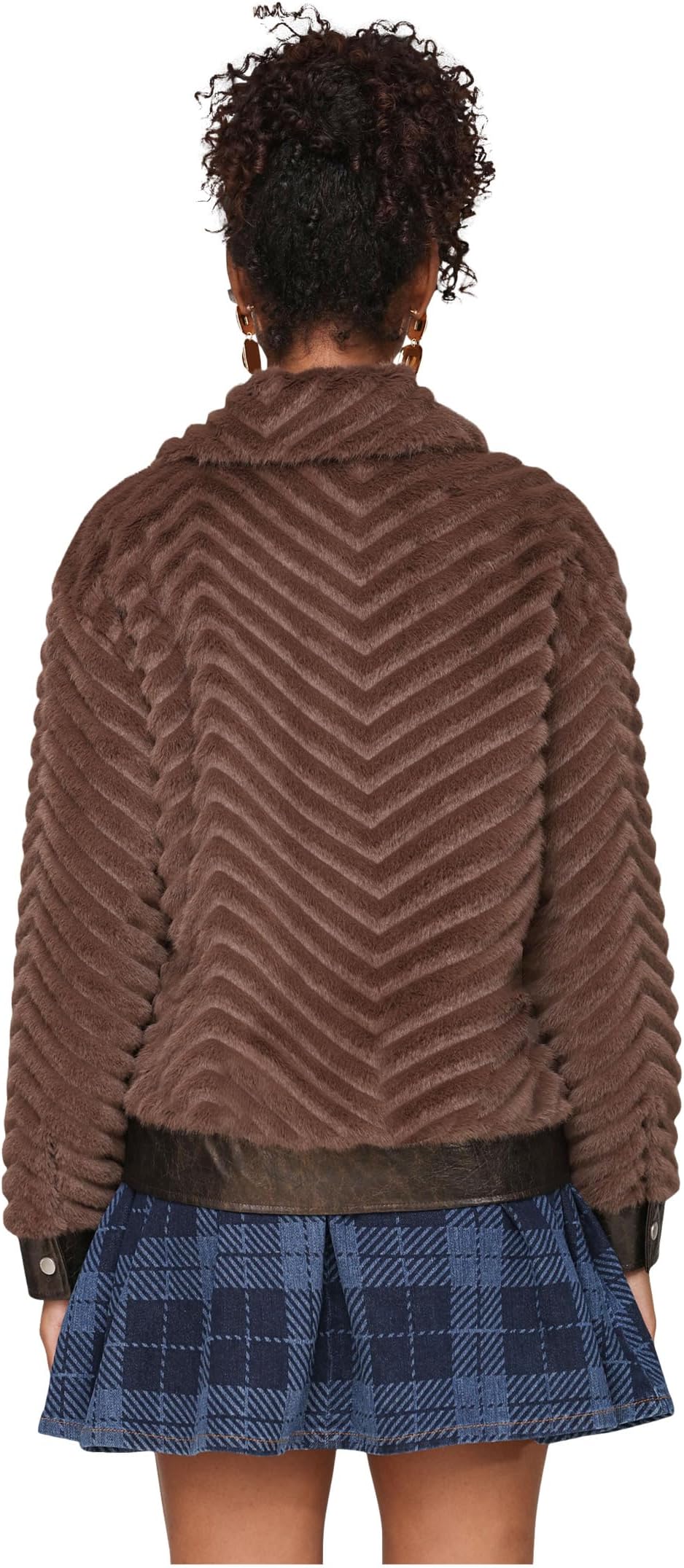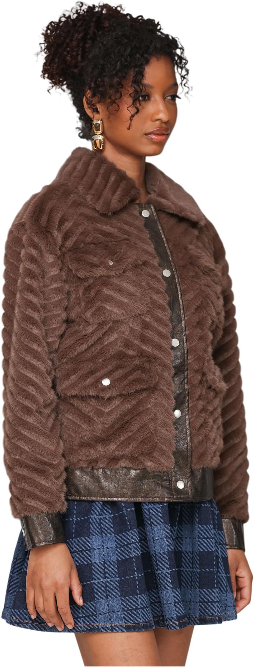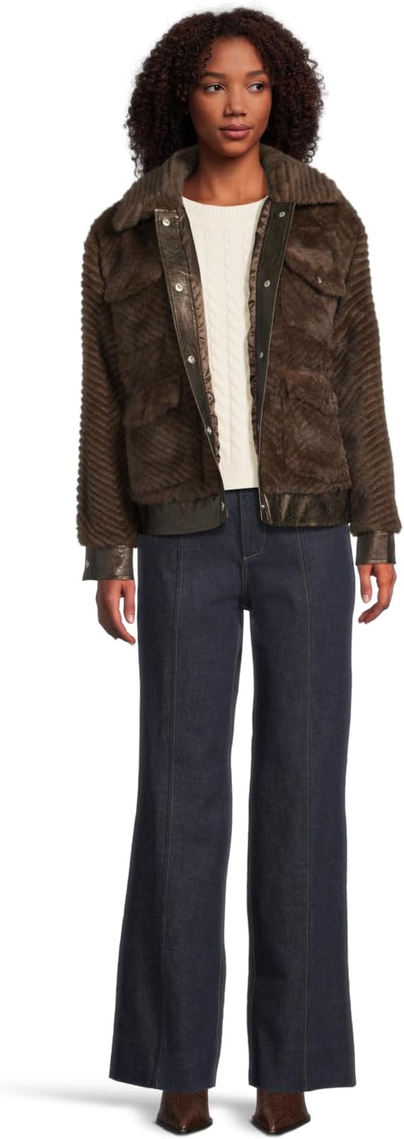 • Уют и мода встречаются в куртке Avec Les Filles Faux Fur Trucket Jacket с богатой шевронной текстурой и контрастной отделкой под глянцевую кожу. Четыре больших накладных кармана с клапанами на пуговицах и классический воротник напоминают о винтажном стиле, а мягкая на ощупь ткань мгновенно добавляет гламура.