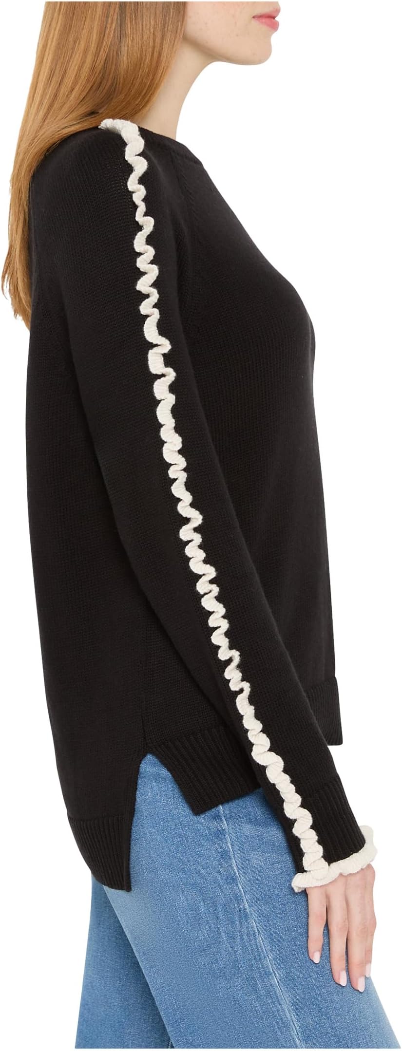 • Уютный и сияющий трикотаж с искусно выполненной отделкой: ключ к изысканной многослойности. Женственный и вневременной, свитер с оборками украшен уникальными оборками от плеч до манжет. Уникальный асимметричный подол и удобный рукав реглан. В пряжу добавлено немного кашемира для дополнительной мягкости.