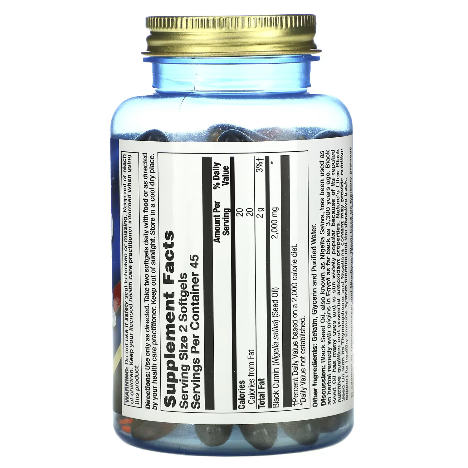 Комментарий: Масло черного тмина, известного также как Nigella Sativa, использовали в Египте как растительное лекарственное средство еще 3300 лет назад. Масло черного тмина нашло многочисленные применения и по-прежнему широко распространено благодаря своим известным питательным качествам и мощным антиоксидантным свойствам. Масло черного тмина от Nature's Life, содержащее тимохинон и нигеллон, может обеспечить поддержку питательными веществами для работы здоровой нервной системы и пищеварительного тракта.