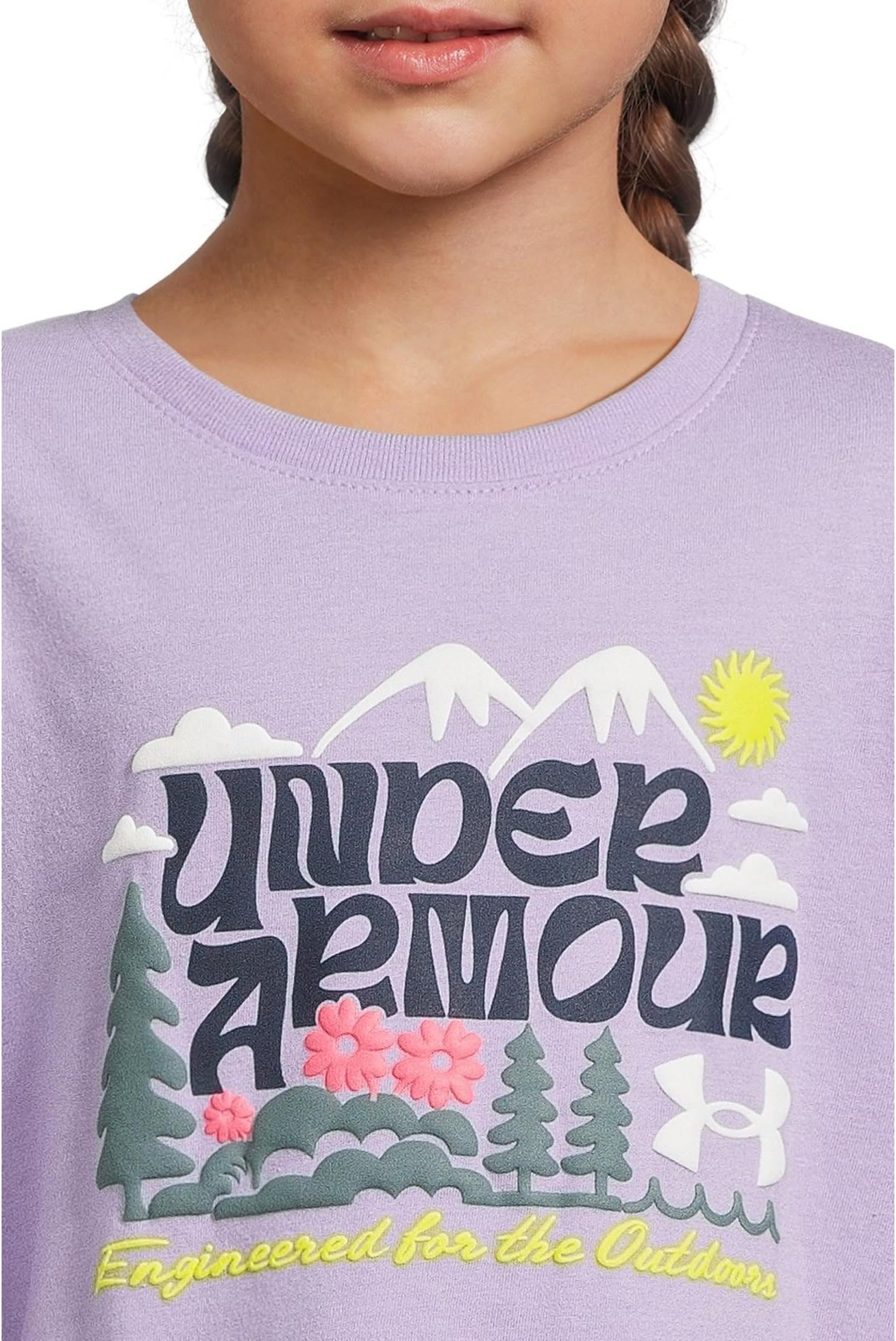 • Создайте милый и непринужденный образ в детской футболке Under Armour Kids Flower Mountain. Эта дышащая футболка легко надевается, имеет круглый вырез горловины, длинные рукава с ребристыми манжетами, графический принт с фирменной символикой на груди и прямой подол.